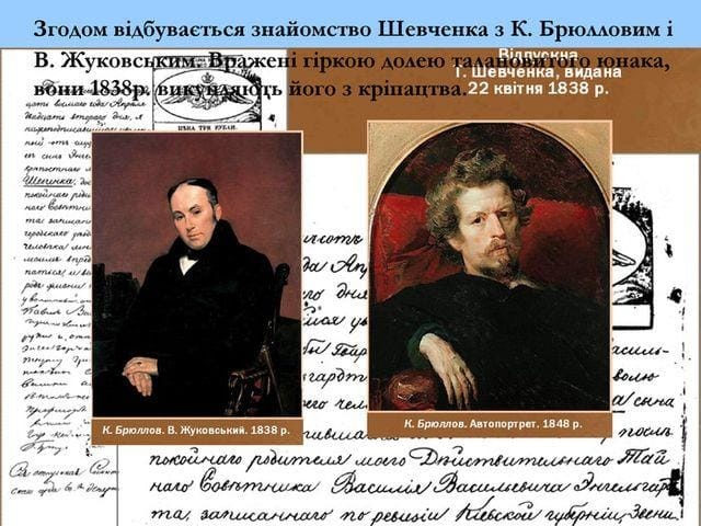 В історії назавжди залишаються імена, які з гордістю пам’ятає і шанує людство. До славної когорти таких людей належить і Великий Кобзар українського народу – Тарас Григорович Шевченко. Весь свій могутній талант він присвятив служінню народові. «Історія мого життя, – писав поет, – становить частинку історії моєї Батьківщини».Народився Тарас Шевченко (1814-1861 рр.) в селі Моринці, що на Черкащині, в сім'ї кріпаків поміщика Павла Енгельгардта.Дуже рано хлопець залишився круглим сиротою. Подальша доля малого Шевченка – аж до викупу його з кріпацтва – була пов'язана з долею П. Енгельгардта та з Петербургом. У Петербурзі Т. Шевченко познайомився з учнем Академії мистецтв Іваном Сошенком, з поетом Євгеном Гребінкою, а згодом – з Карлом Брюлловим і Василем Жуковським, які відіграли в життіТ. Шевченка надзвичайну роль, які викупили його з кріпацтва у 1838 р. за 2500 рублів. Того ж року Т. Шевченка зарахували учнем Академії мистецтв. Навчався він під керівництвом Карла Брюллова. А вже 18 квітня 1840 р. з'явилася перша збірка поезій – «Кобзар» – подія величезного значення не тільки в історії української літератури, а й у самосвідомості українського народу. Всього за життя Шевченко створив 235 поетичних творів: віршів, поем та балад, при цьому деякі з віршів поета мають декілька дуже відмінних один від одного варіантів, кожен з яких вважається окремим твором.