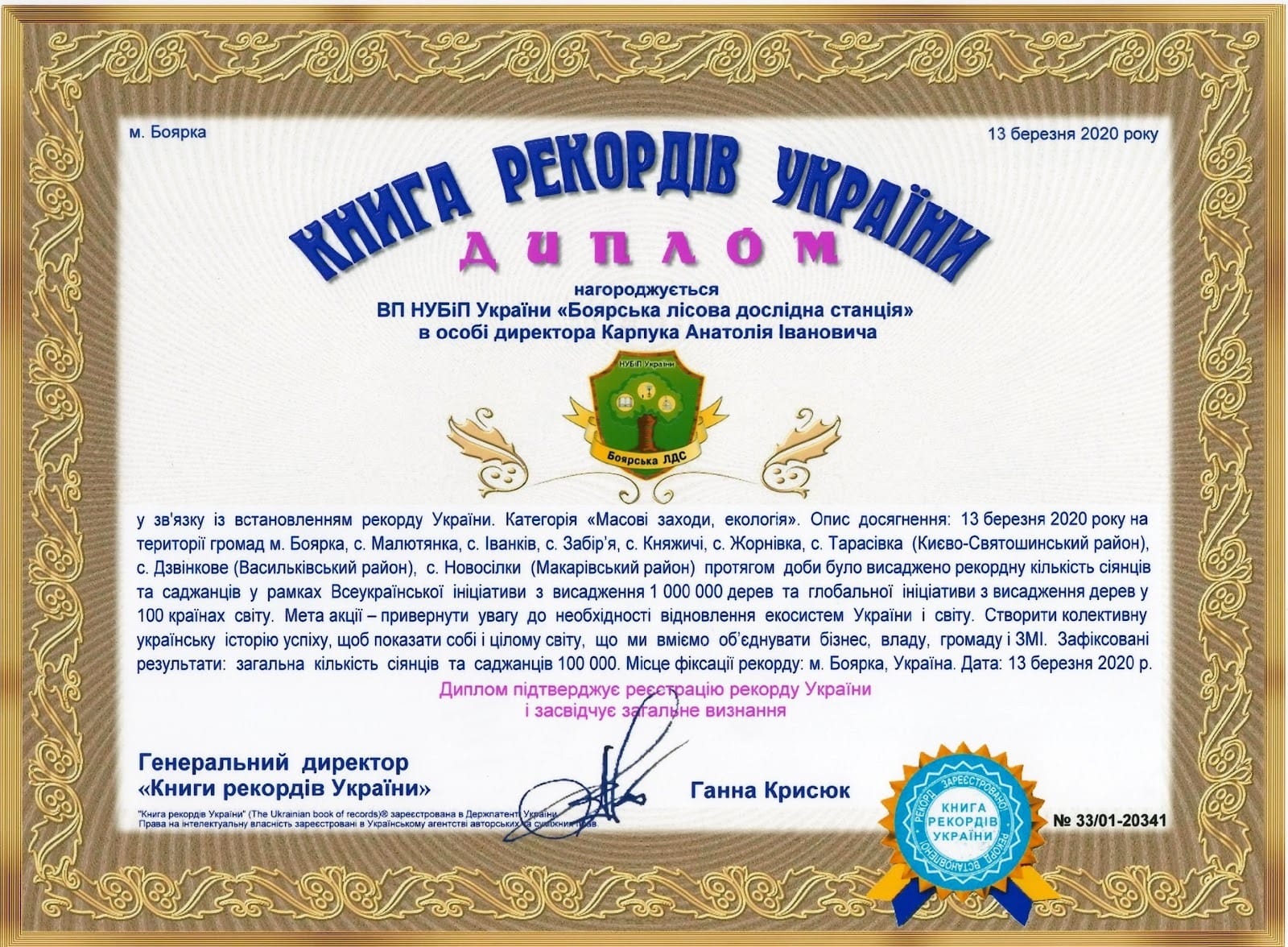 Окрім цього, Боярська лісова дослідна станція цієї весни долучилась до Всеукраїнського проекту «Озеленення України». В його рамках був встановлений Рекорд України – протягом 5 годин висаджено 100 000 шт. сіянців аборигенних деревних видів. До встановлення рекорду долучились місцеві жителі, представники Боярської міської ради, Малютянської, Забірської, Княжицької, Дзвінківської та Новосілківської сільських рад, Укрцентркадриліс, Боярського коледжу екології і природних ресурсів, ПрАТ «ВЕНТС», Києво-Святошинського відділу поліції, комунальних підприємств – КП «БоярськеГВУЖКГ» та КП «Боярка-Водоканал».