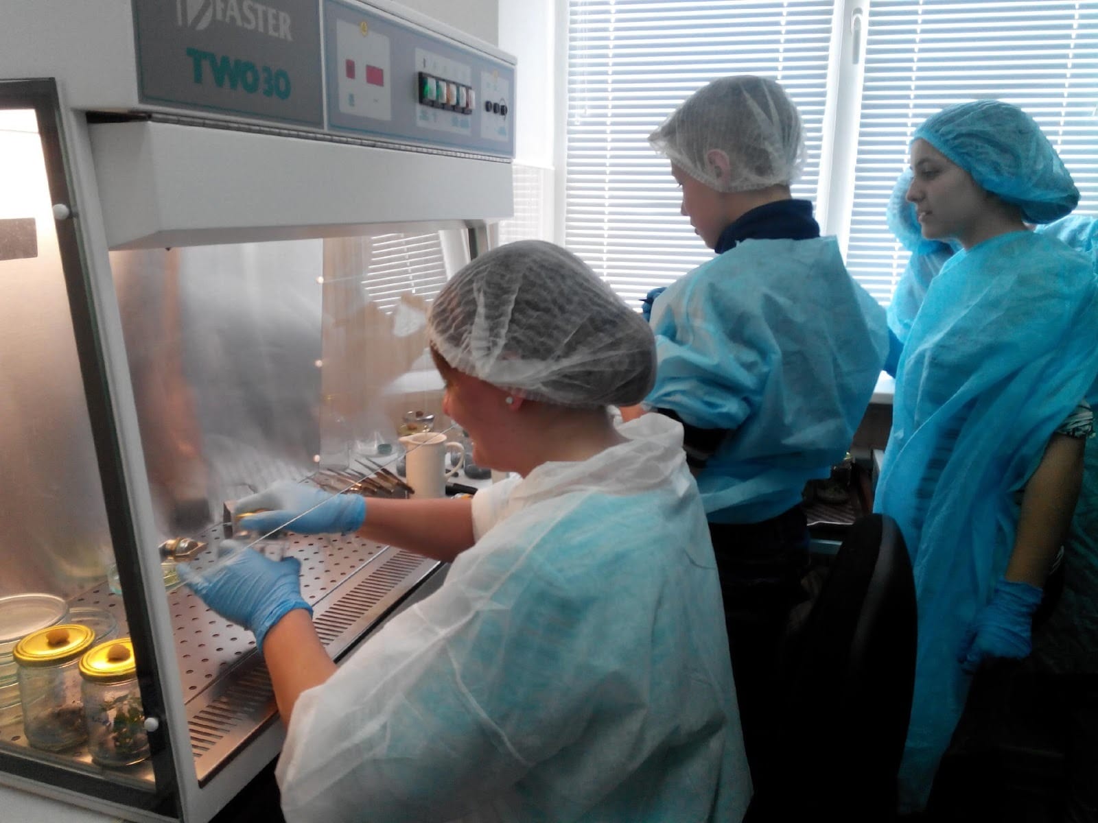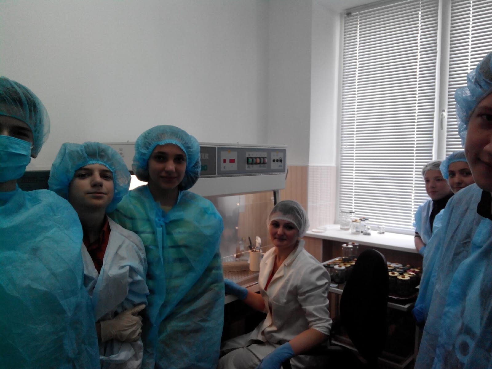 Оскільки усі операції у лабораторії біотехнологічного профілю передбачають стерильність, тому перед початком заняття гуртківці одягли комплект стерильного одягу: халат, шапочку й бахали.