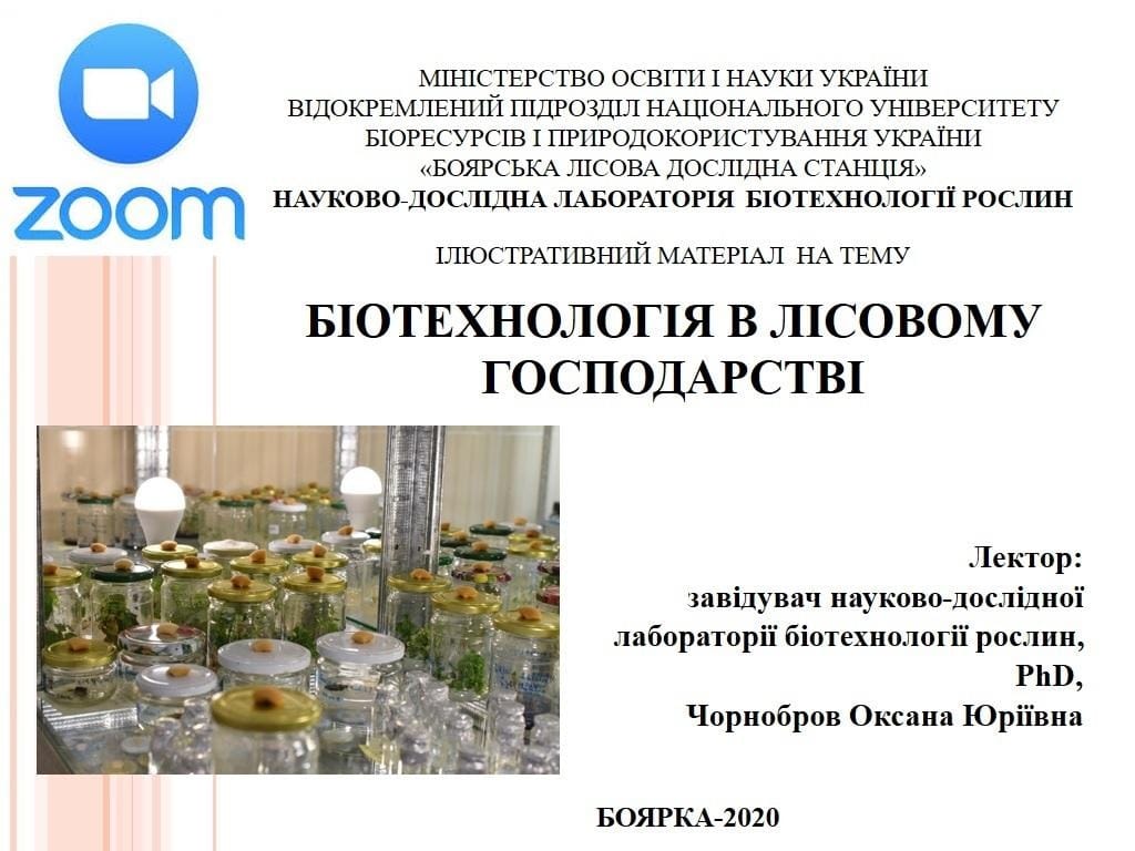 22 червня 2020 року завідувач науково-дослідної лабораторії біотехнології рослин ВП НУБіП України «Боярська ЛДС» Оксана Чорнобров прочитала онлайн-лекцію на тему «Біотехнологія в лісовому господарстві» для помічників лісничих державних лісогосподарських підприємств України, які підвищують кваліфікацію в «Укрцентркадриліс». Онлайн-заняття було проведено за використання платформи Zoom та складалося із теоретичного матеріалу, відео-ролику та обговорення у форматі дискусії щодо можливості й переваг застосування новітніх технологій у лісовому господарстві.