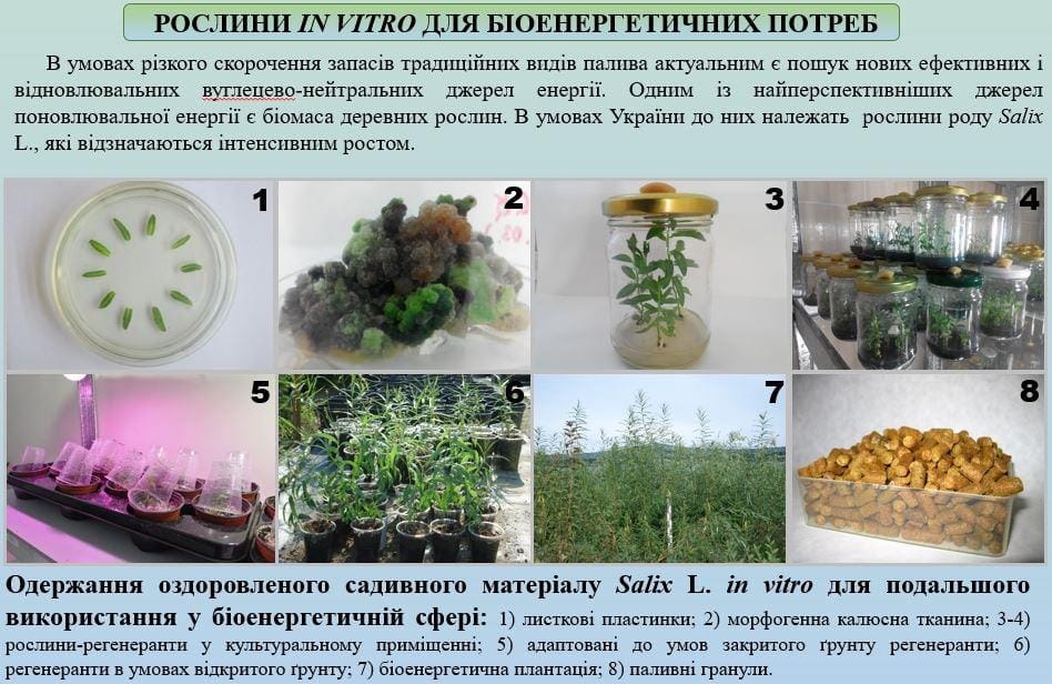 Науковими співробітниками НДЛ біотехнології рослин ВП НУБіП України «Боярська ЛДС» здійснено низку фундаментальних та прикладних досліджень щодо розроблення ефективних протоколів розмноження в культурі тканин in vitro деревних, декоративних та ягідних видів рослин із одержанням високоякісного садивного матеріалу. Зокрема, наводимо біотехнологічний процес отримання зникаючих, лісотвірних та біоенергетичних рослин in vitro із фрагментів тканин на штучних живильних середовищах (починаючи від введення в умови in vitro і закінчуючи адаптацією/створенням плантації/одержанням біопалива). Наші розробки захищені Патентами України на корисну модель.