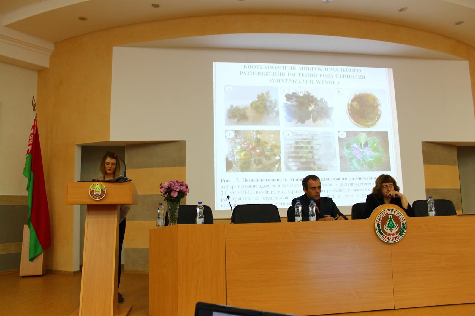 На особливу увагу заслуговую дослідження, які наші білоруські колеги проводять в лабораторії генетики та біотехнології. Вона містить надсучасне обладнання, а співробітники проходять стажування у передових лабораторіях Польщі, Німеччини, Австрії, Литви. Основні напрями досліджень направлені на збереження цінних генотипів деревних рослин з використанням біотехнологічних методів, вирощування мікроклонально розмноженого садивного матеріалу деревних рослин, створення колекції культур in vitro лісових видів, молекулярно-генетичний аналіз, популяційно-генетичну оцінку, паспортизацію клонів, генно-географічне картування, моніторинг стану генетичного різноманіття, оцінку генетичного потенціалу селекційних об’єктів. При лабораторії функціонує генетичний банк насіння лісових деревних видів Білорусії та фітопатологічний центр. Банк забезпечує вилучення насіння із шишок, їх обезкрилювання і очистку, додаткову очистку, висушування і пакування, зберігання у холодильній й морозильній камері, рентгенографію та оцінку лабораторної схожості. Ще однією адресою конференції був дослідно-виробничий об’єкт Коренівська експериментальна лісова база, яка містить республіканський генетичний банк сосни звичайної (створений у 1983−1987 рр.), колекційні культури цінних форм берези карельської тощо.