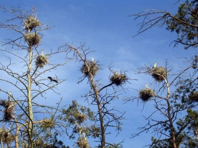 Чаплі гніздяться на вікових соснах, що переважають у деревостані.