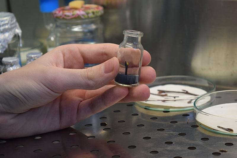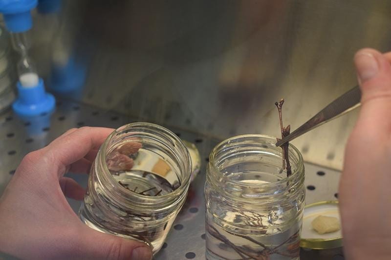 Із надзвичайною ретельністю учні працювали у ламінарному боксі: стерилізували інструменти, нарізали експлантати та їх субкультивували на ним ж приготовлене живильне середовище. Усього введено в культуру in vitro 33 стерильних експлантати на базове живильне середовище за прописом MS. Уже на наступному тижні будемо оцінювати ефективність підібраних режимів стерилізації рослинного матеріалу та їх вплив на нейтралізацію екзогенної мікробіоти.