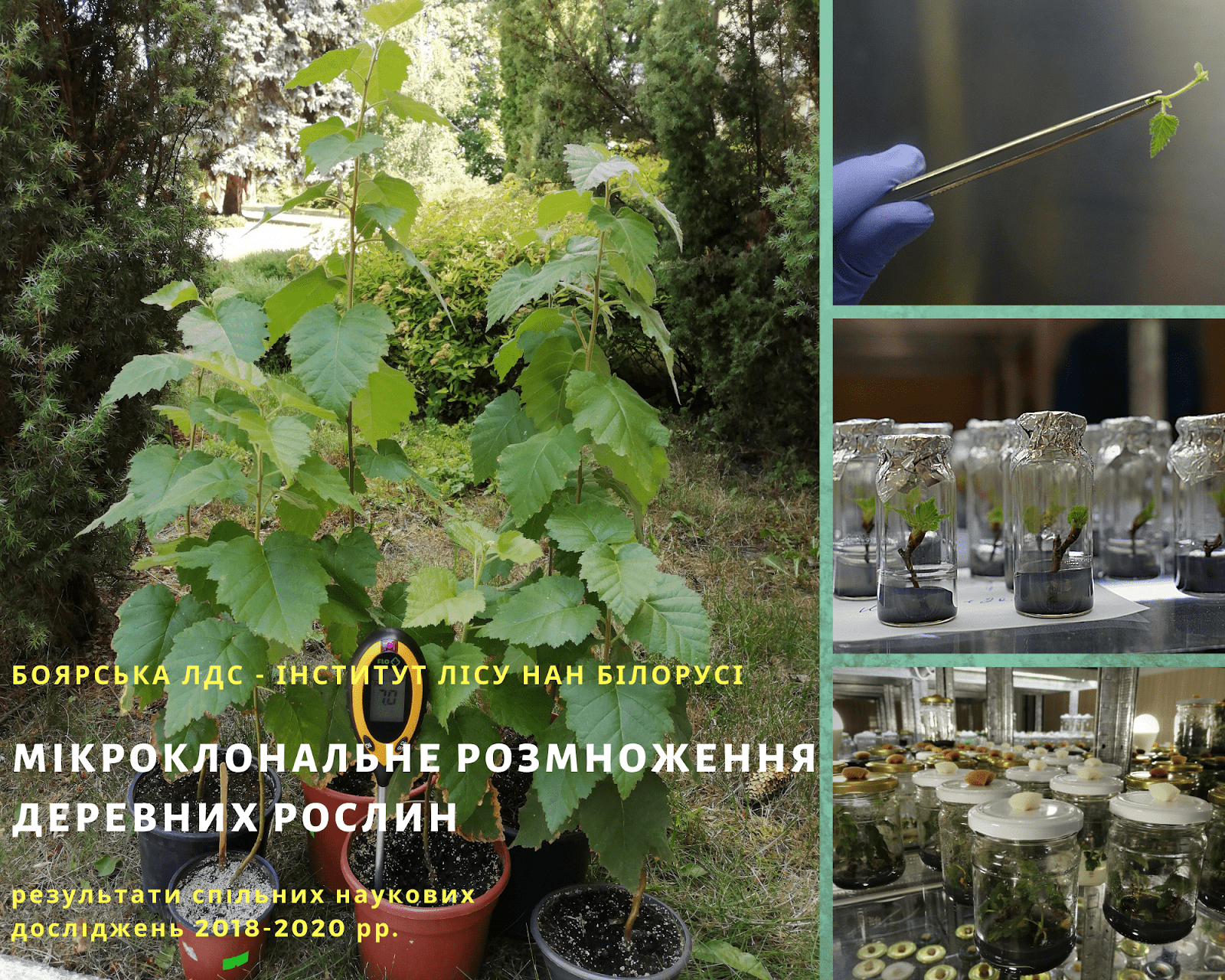 Нагадаємо, що в науково-дослідній лабораторії біотехнології рослин ВП НУБіП України «Боярська ЛДС» проводяться дослідження щодо розроблення протоколів in vitro деревних, декоративних, ягідних та швидкорослих рослин ( http://blds.com.ua/naukovij.html ).