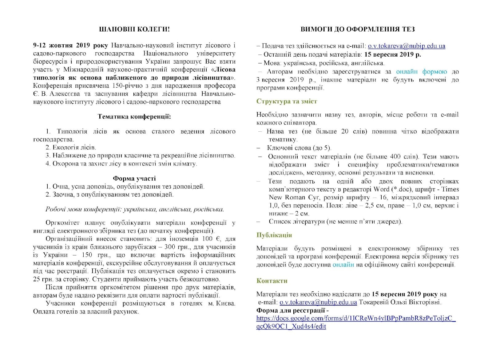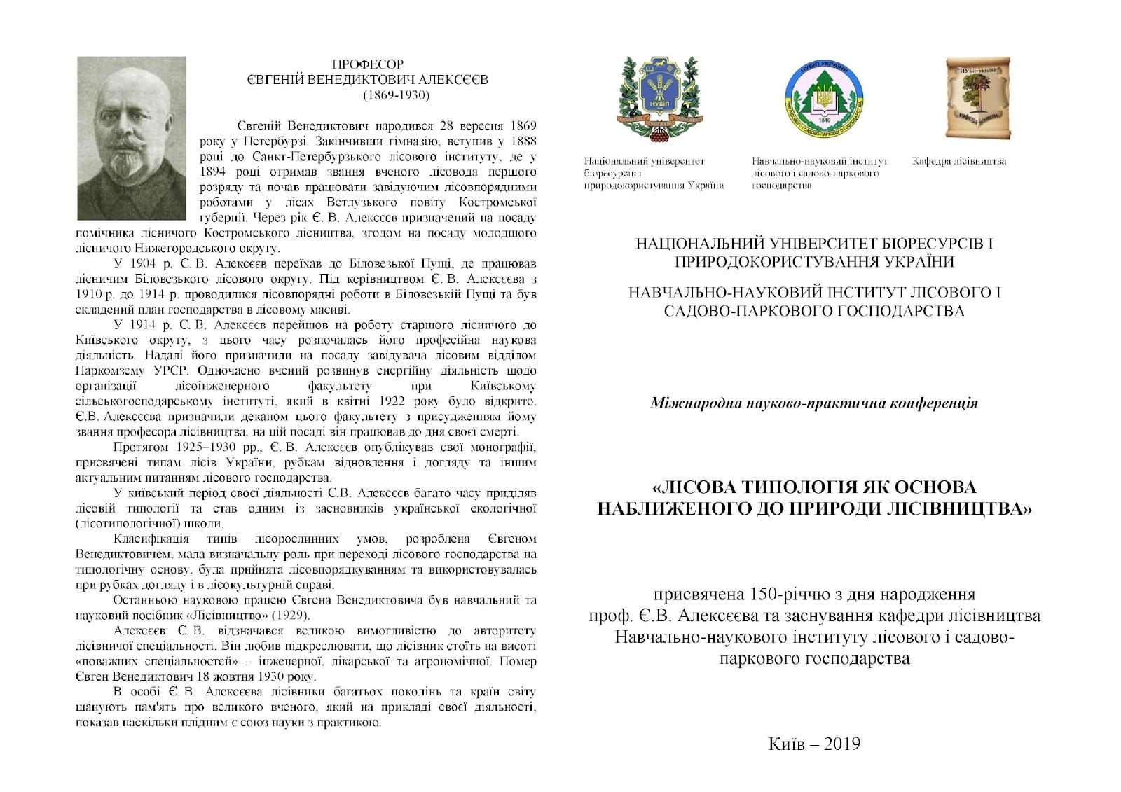 ШАНОВНІ КОЛЕГИ! 9-12 жовтня 2019 року Навчально-науковий інститут лісового i садово-паркового господарства Національного університету бiopecypciв i природокористування України запрошує Вас взяти участь у Міжнародній науково-практичній конференції «Лісова типологія як основа наближеного до природи лісівництва» . Конференція присвячена 150-річчю з дня народження професора Є. В. Алексєєва та заснування кафедри лісівництва Навчально-наукового інституту лісового і садово-паркового господарства.