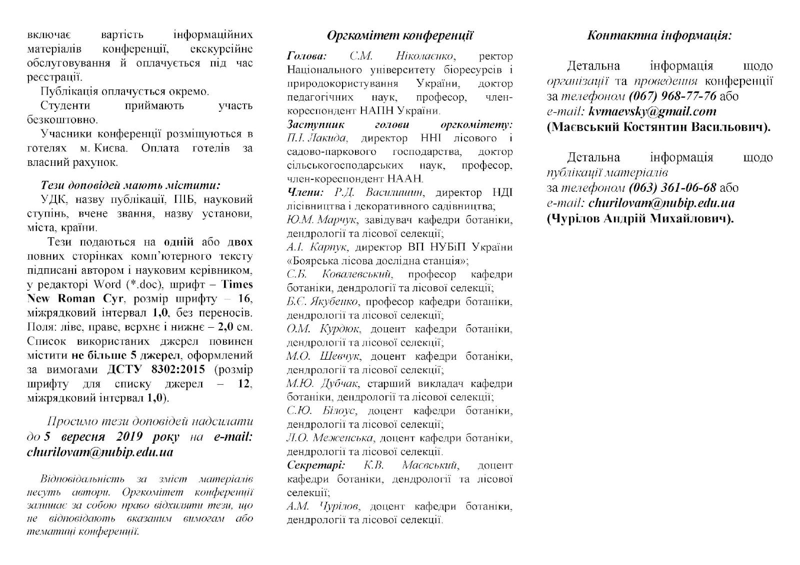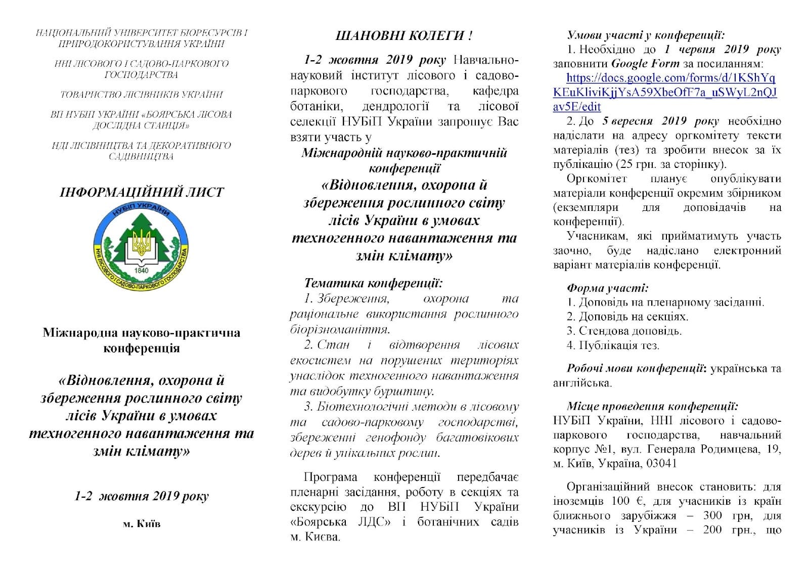 ШАНОВНІ КОЛЕГИ! 1-2 жовтня 2019 року Навчально-науковий інститут лісового i садово-паркового господарства, кафедра ботаніки, дендрології та лісової селекції НУБіП України запрошує Вас взяти участь у Міжнародній науково-практичній конференції «Відновлення, охорона й збереження рослинного світу лісів України в умовах техногенного навантаження та змін клімату».