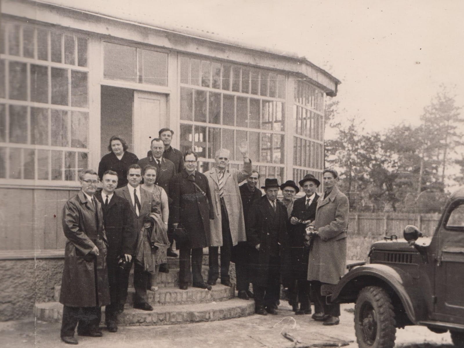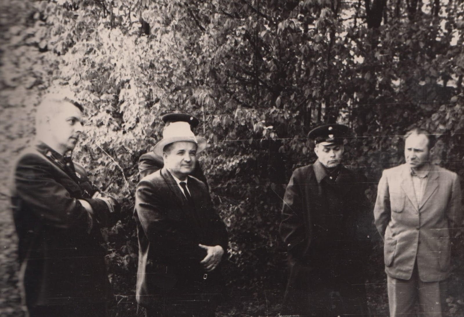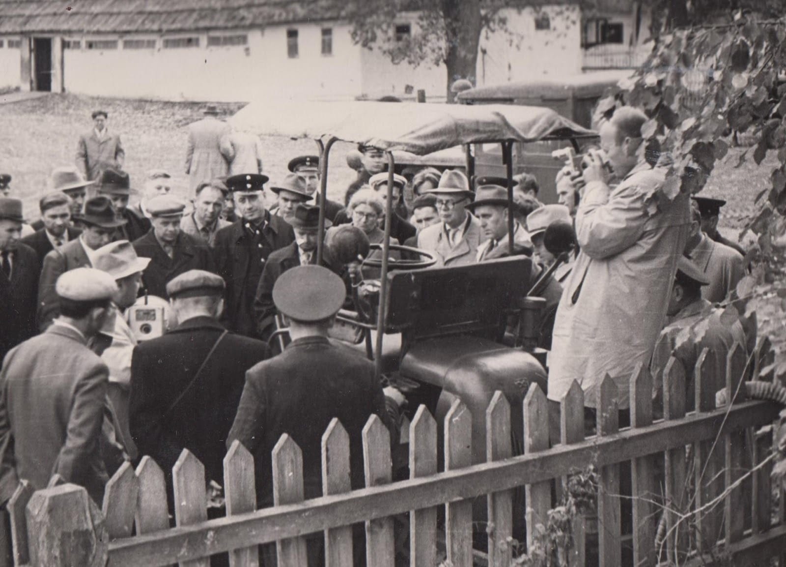 Фото 1. Заступник начальника Головного управління лісотехнічних і лісогосподарських ВУЗів Карпенко М. І. та директор Київського лісогосподарського інституту Шевченко В. А. в присутності керівництва лісгоспу директора Чернеги О. Н. та доц. Бикова М. К. (1948 р.)