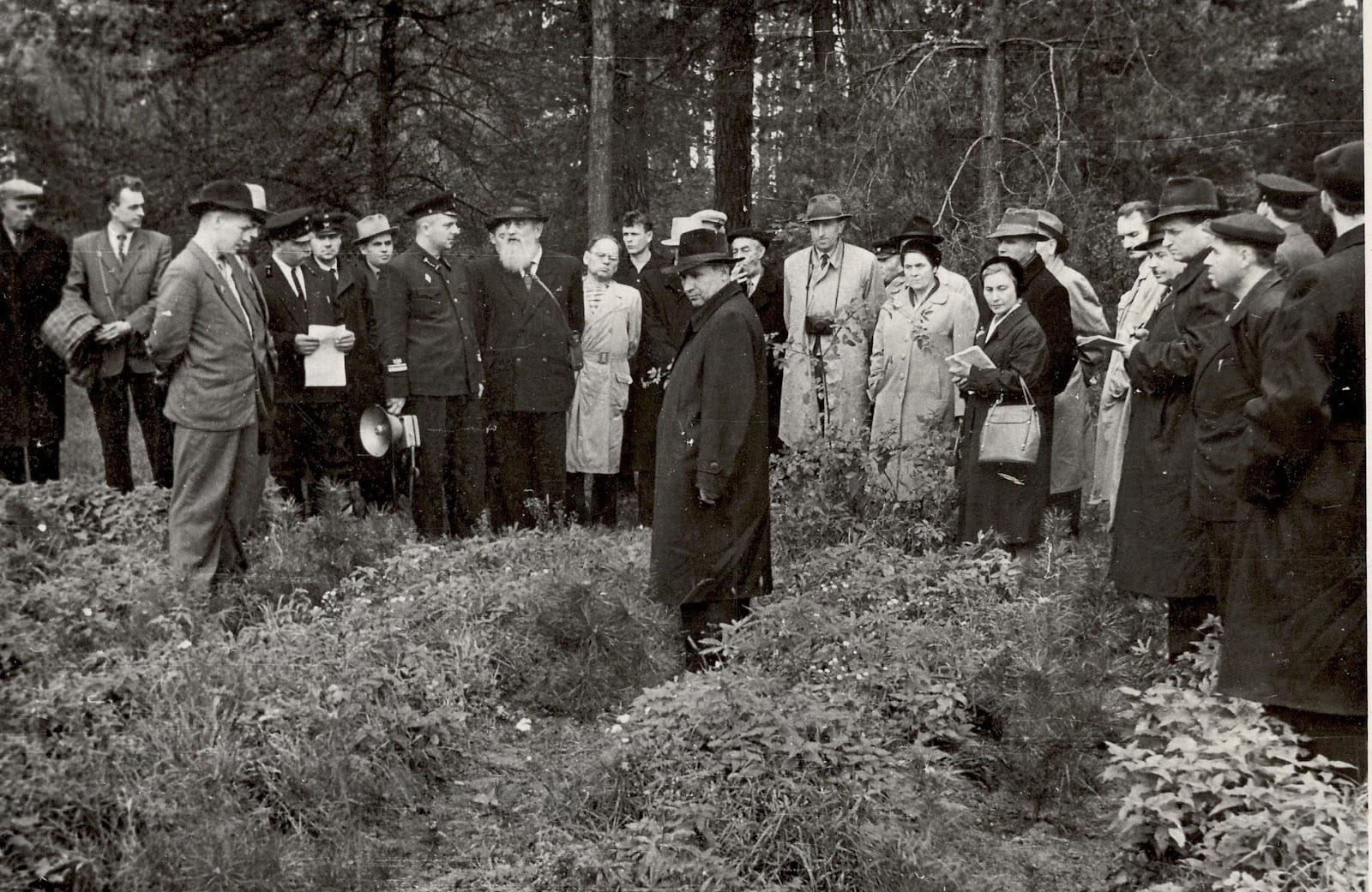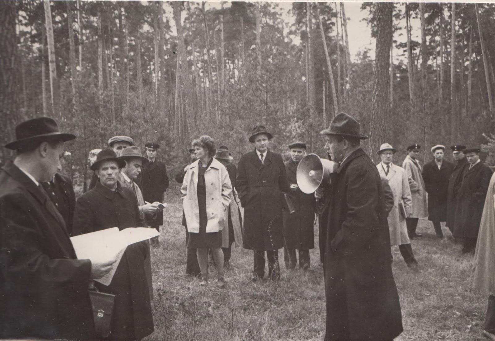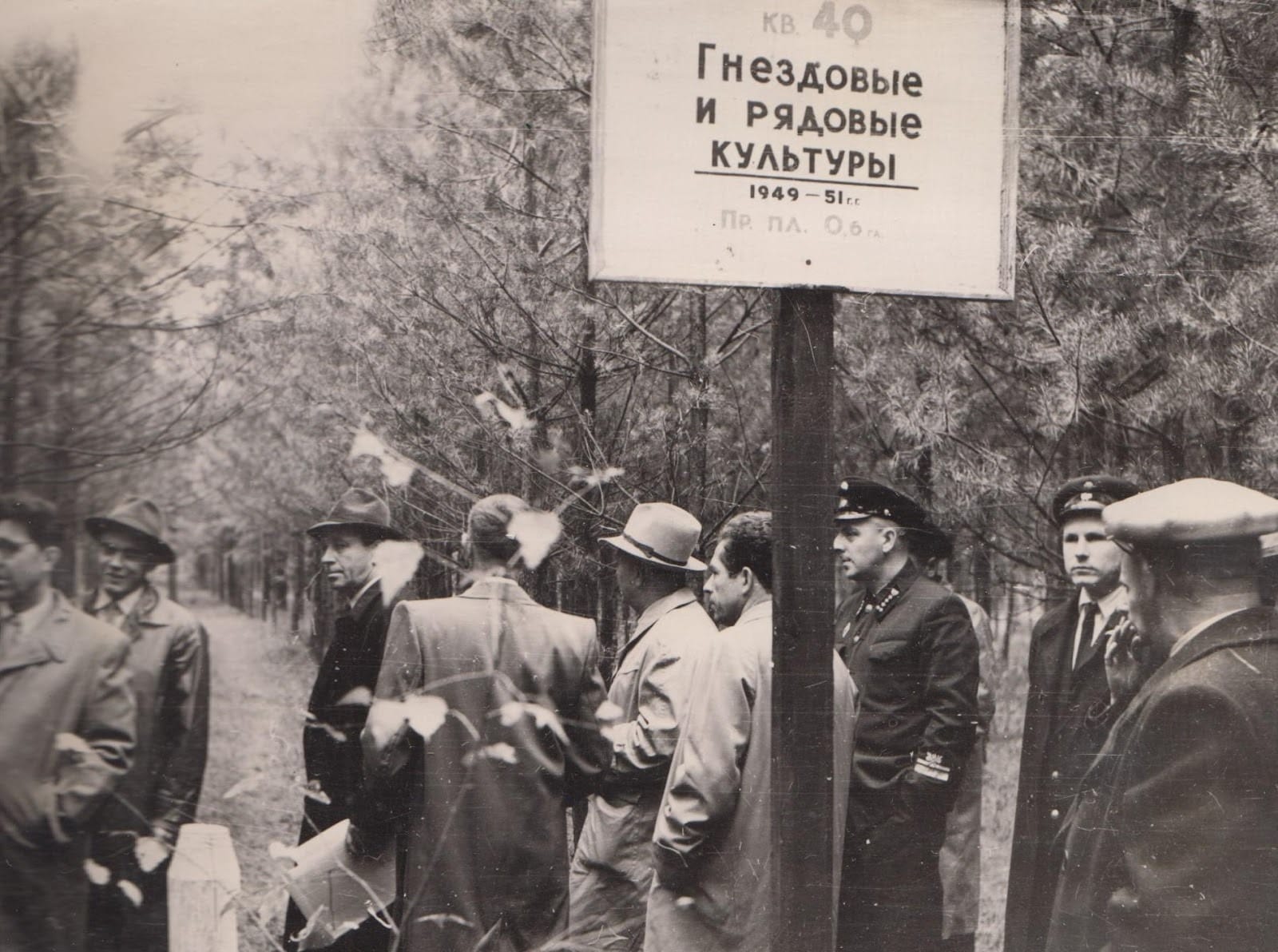 Фото 11. Огляд дослідних культур сосни звичайної у міжряддях яких посіяно люпин багаторічний під керівництвом проф. Б. Й. Логгінова. Жорнівське лісництво (1962 р.)