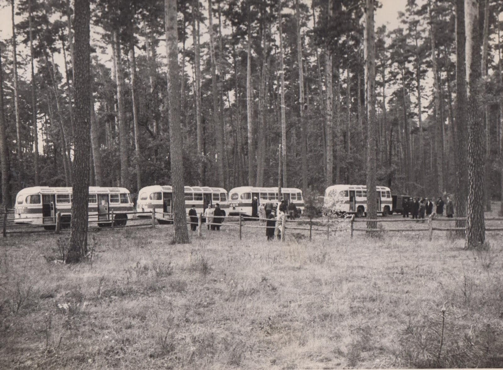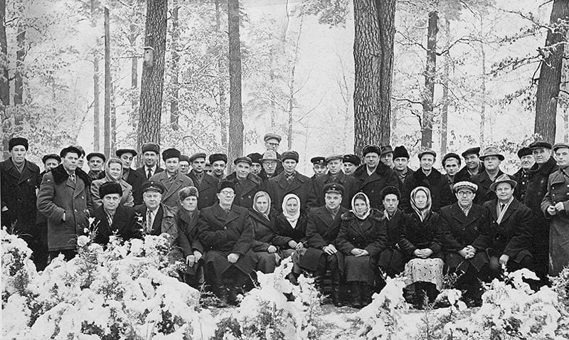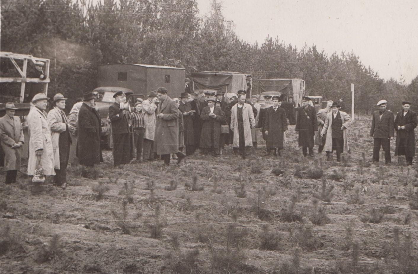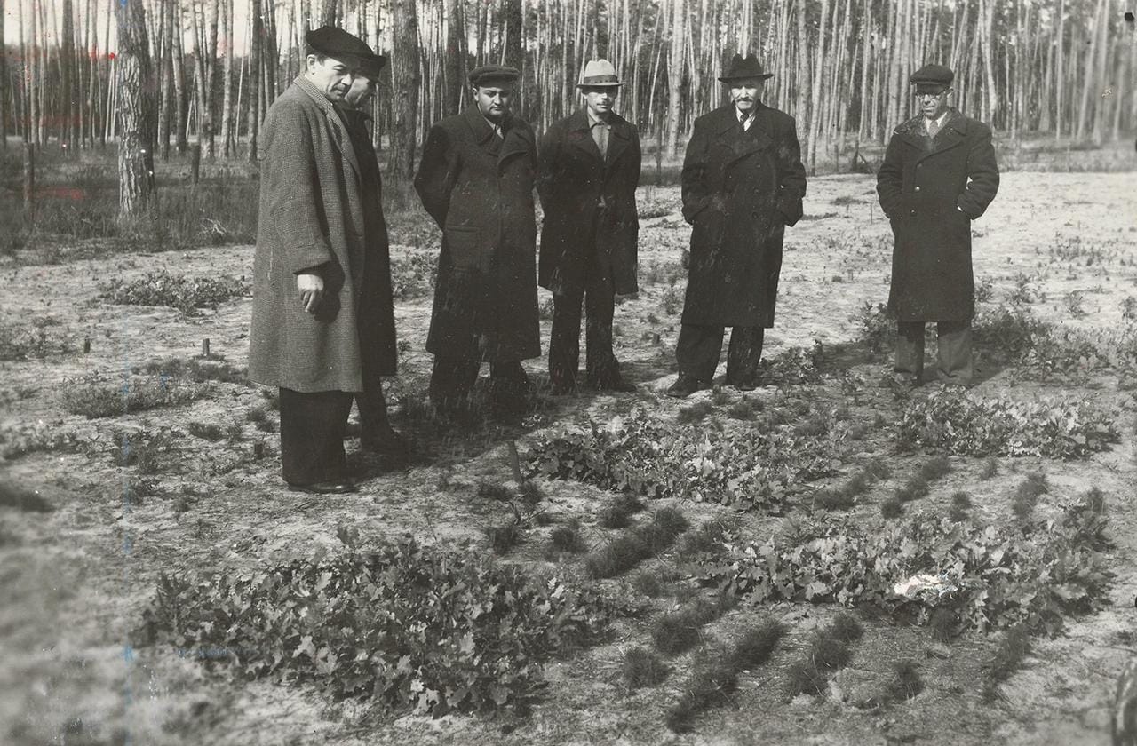 Фото 11. Огляд дослідних культур сосни звичайної у міжряддях яких посіяно люпин багаторічний під керівництвом проф. Б. Й. Логгінова. Жорнівське лісництво (1962 р.)