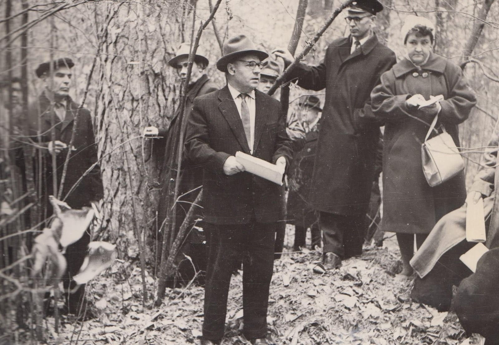Фото 17. Доц. П. М. Мегалінський дає роз’яснення на дослідній ділянці природнього поновлення сосни звичайної в Дзвінківському лісництві (10.10.1963 р.)