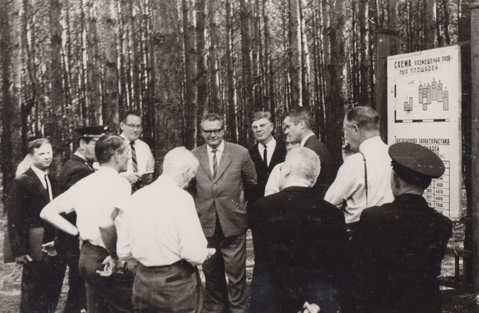 Фото 10. Огляд культур сосни звичайної в Плесецькому лісництві під керівництвом проф. Б.Й. Логгінова (1962 р.)