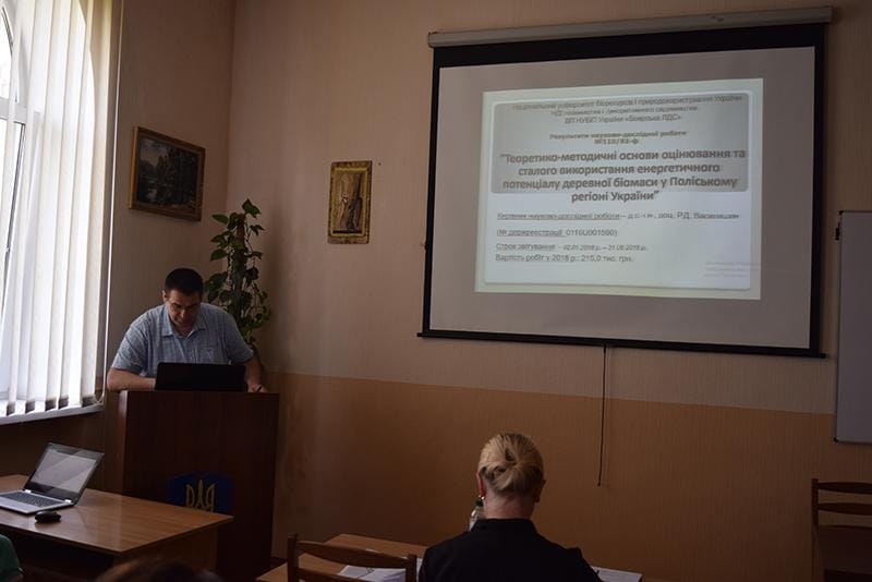 Про результати виконання науково-дослідної роботи за темою 110/83-ф «Теоретико-методичні основи оцінювання та сталого використання енергетичного потенціалу деревної біомаси у Поліському регіоні України» прозвітував її керівник – Р. Д. Василишин. Зазначив, що за звітний період на основі опрацьованих у попередніх етапах нормативно-довідкових таблиць для кількісної оцінки енергетичних запасів в компонентах фітомаси дерев та деревостанів у одиницях первинної енергії, розроблено рекомендації щодо використання нормативно-інформаційного забезпечення для таксаційної оцінки енергоємності компонентів фітомаси деревостанів та енергопродуктивності лісових насаджень. Також підготовлено до друку науково-виробничий довідник «Нормативно-довідкові матеріали для оцінювання енергетичної функції лісів Українського Полісся». За цей час також захищено дві дипломних роботи на напрямом досліджень у межах НДР та опубліковано тези доповіді «Лісова біоенергетика як складова сталого розвитку Поліського регіону».