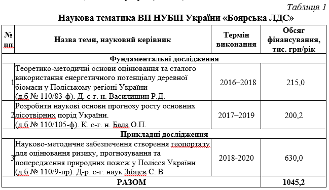 Безпосередньо у ВП НУБіП України «Боярська лісова дослідна станція» виконуються 2 фундаментальні та 1 прикладна наукові теми, фінансування яких становить 1045,200 тис. грн/рік (табл. 1).