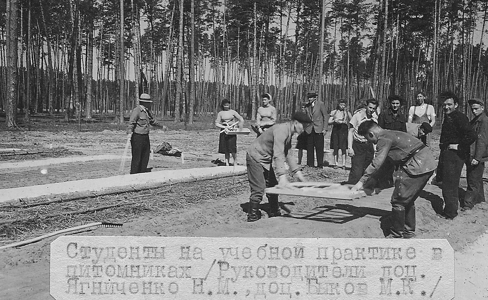 Фото 2. Студенти ІІІ курсу на навчальній практиці у лісовому розсаднику (керівники практики доц. Н. М. Ягниченко, доц. Биков М.К.), 1948 р.