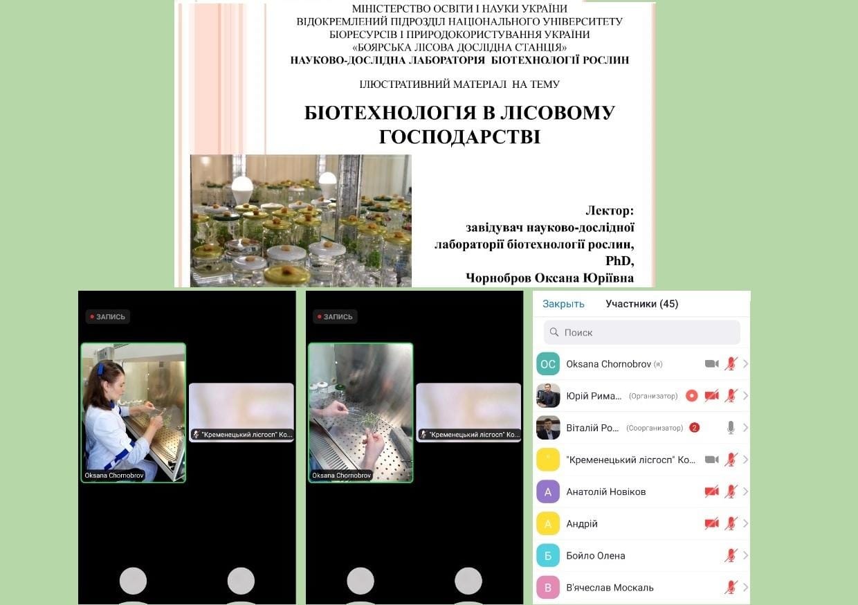 15 червня для слухачів державних лісогосподарських підприємств України, які підвищують кваліфікацію в «Укрцентркадриліс» проведено заняття в онлайн-режимі із використання платформи Zoom. Інженери лісових культур і головні лісничі прослухали лекційний матеріал та в режимі онлайн ознайомилися з усіма стадіями мікроклонального розмноження деревних рослин.