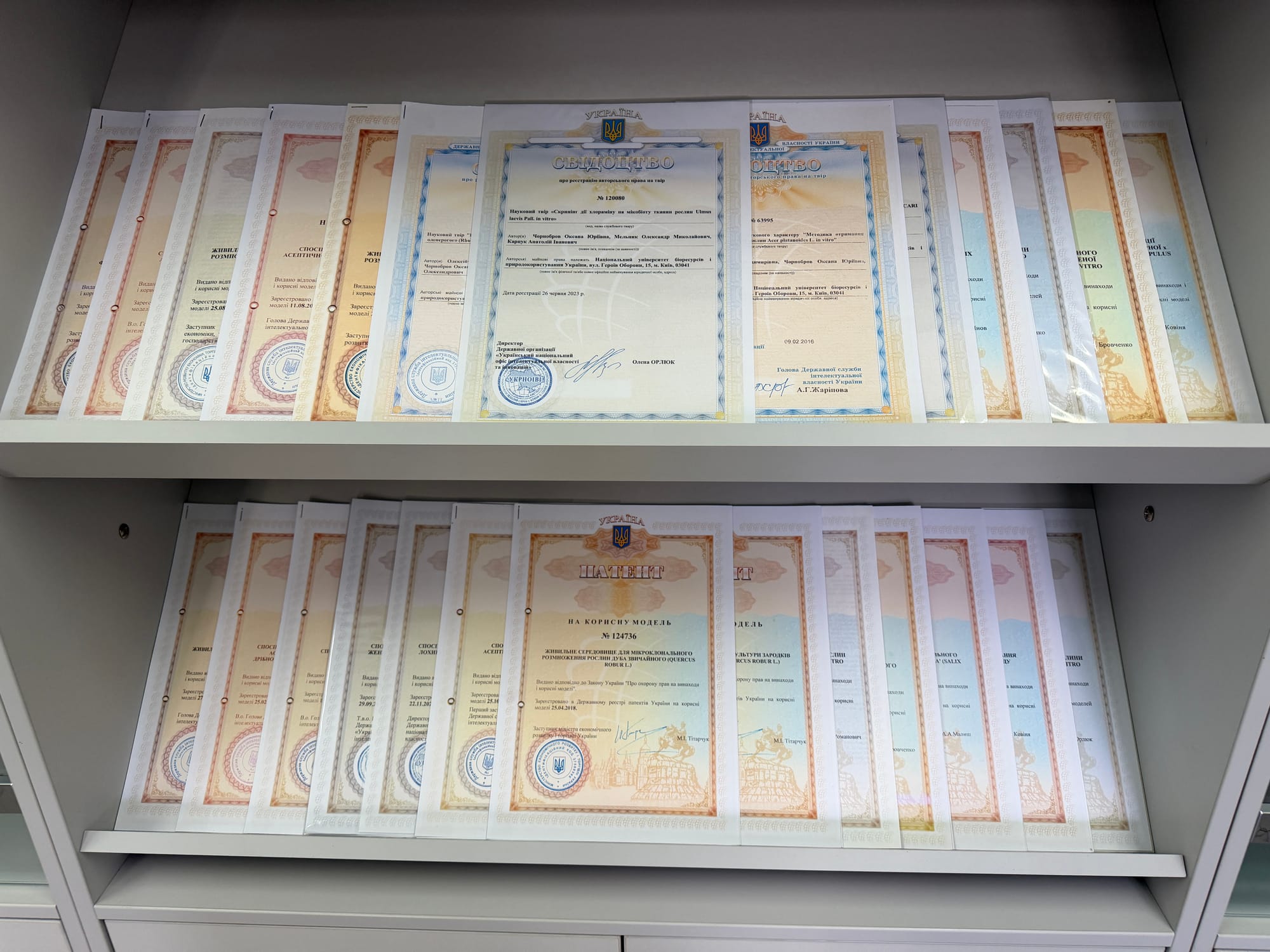 Ураховуючи надзвичайно важливе значення патентів для наукової діяльності, наукова робота вчених Науково-дослідної лабораторії Біотехнології рослин ВП НУБіП України цілеспрямовано орієнтована на дослідження, результати яких підлягають патентуванню. Станом на 2026 рік наша лабораторія має 33 охоронних документи, з них: 24 патенти України на корисну модель та 9 авторських свідоцтв. Наші дослідження отримали статус патенту, оскільки відповідали ключовим критеріям патентоздатності: новизна, відмінність, винахідницький рівень та промислова придатність.