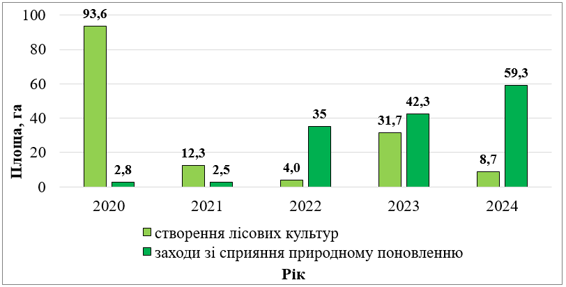 Висаджено близько 227,2 тис. шт сіянців головних лісотвірних порід, серед яких сосна, дуб, береза, клен, ялина та ін. Лісові культури створено на площі 8,7 га, доповнення проведено на площі 81,1 га. Окрім того, проведені заходи сприянню природному поновленні на площі 59,3 га.