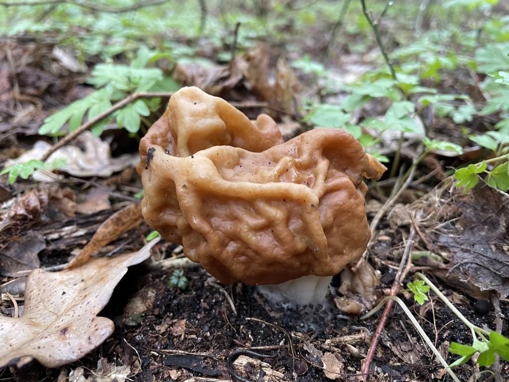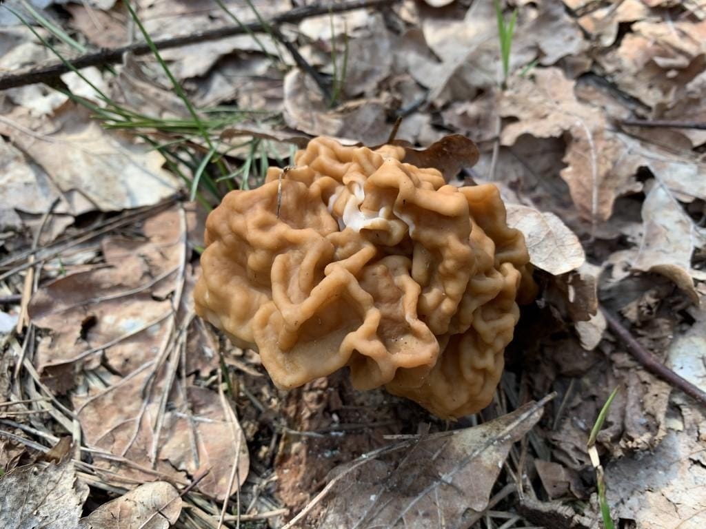 Навесні у лісах Київщини можна зустріти незвичайного гриба - Строчка гіганського (Gyromitra gigas Krombh.). Він має дуже багато місцевих назв, таких як: сніговий сморчок, мозок теляти або бичачий ніс. Іноді його помилково збирають замість зморшка їстівного, від якого він чітко відрізняється будовою шапки та формою плодового тіла.