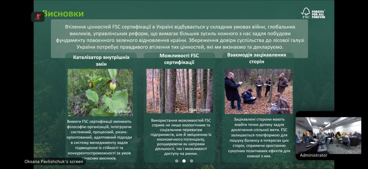 Форум зібрав провідних фахівців галузі, представників державних органів, науковців, міжнародних експертів та громадських організацій. Метою зустрічі стало обговорення сучасного стану та перспектив FSC-сертифікації в Україні — як інструменту, що поєднує екологічну відповідальність, соціальні стандарти та економічну доцільність у лісовому господарстві. Участь у подібних заходах є для нашої станції не просто формальністю — це можливість бути в центрі фахової дискусії, ділитися науковим досвідом і разом із партнерами формувати майбутнє українського лісівництва.