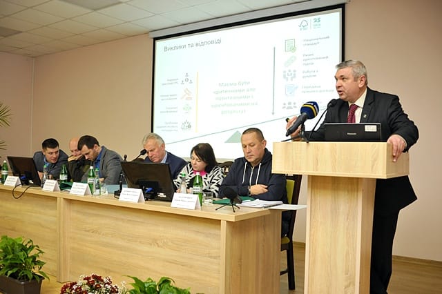 Завідувач кафедри відтворення лісів та лісових меліорацій Віктор Маурер презентував продукцію розсадників Державного агентства лісових ресурсів – лісовий і садивний матеріал. Бо лісівникам найперше потрібно налагодити виробництво якісного садивного матеріалу, що забезпечить високу приживлюваність лісових культур і стійкість майбутніх насаджень. А машини та механізми для лісового господарства представив професор кафедри лісівництва Володимир Гриб .
